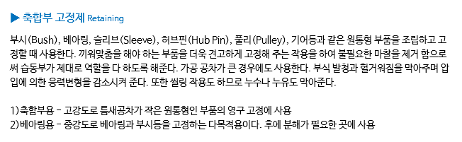 ▶ 축합부 고정제 Retaining 부시(Bush), 베아링, 슬리브(Sleeve), 허브핀(Hub Pin), 풀리(Pulley), 기어등과 같은 원통형 부품을 조립하고 고정할 때 사용한다. 끼워맞춤을 해야 하는 부품을 더욱 견고하게 고정해 주는 작용을 하여 불필요한 마찰을 제거 함으로써 습동부가 제대로 역할을 다 하도록 해준다. 가공 공차가 큰 경우에도 사용한다. 부식 발청과 헐거워짐을 막아주며 압입에 의한 응력변형을 감소시켜 준다. 또한 씰링 작용도 하므로 누수나 누유도 막아준다. 1)축합부용 - 고강도로 틈새공차가 작은 원통형인 부품의 영구 고정에 사용 2)베아링용 - 중강도로 베아링과 부시등을 고정하는 다목적용이다. 후에 분해가 필요한 곳에 사용